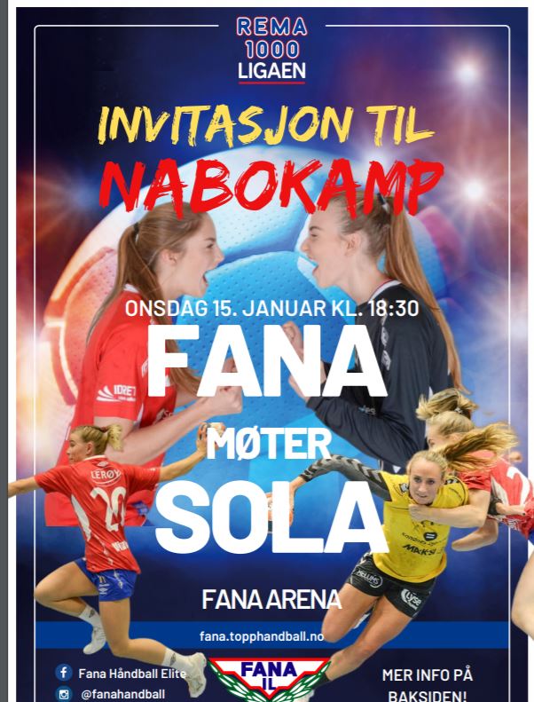 Når Sola kommer til Fana Arena onsdag 15.januar inviterer vi like godt alle naboene vår på kamp. Håper du har fått invitasjon i postkassen, og at du melder deg på til marked@fanail.no. Kampen starter kl 18:30 men vi åpner dørene kl 17:30.