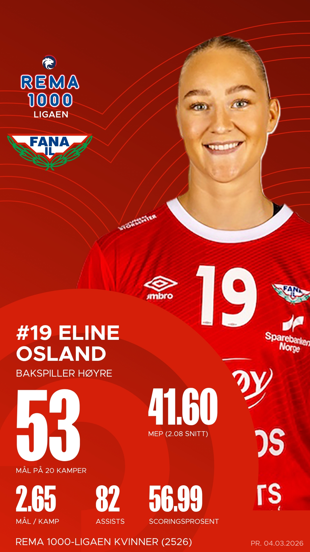 Fana stiller med flere profiler i toppform. Martine Kårigstad Andersen har vært en motor i laget gjennom hele sesongen – en bakspiller med både kraft og presisjon, og med et imponerende antall mål og assists. Christine Karlsen Alver styrer angrepsspillet med kløkt og tempo, og hennes samarbeid med Eline Osland på høyresiden har gitt mange gjennombrudd og lekre scoringer. Osland har vært blant lagets mest kreative spillere, med både målfarlighet og evne til å sette medspillere i gode posisjoner.